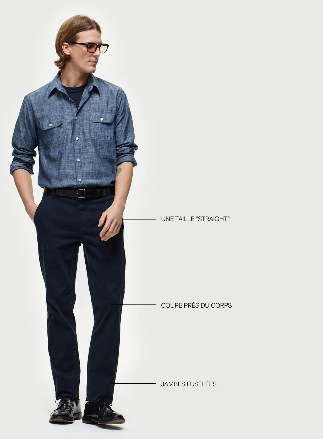 Plus élégant qu’un jean et plus souple qu’un pantalon de costume, le chino est le parfait entre deux. Le chino est confectionné dans un sergé de coton doux, il offre une tenue impeccable du matin au soir. Porté avec une veste de peintre et une chemise, l'association zéro faute. Associé à un tee-shirt et des baskets, il adopte une allure plus décontractée. Le chino est une pièce polyvalente et essentielle, pensée pour durer.