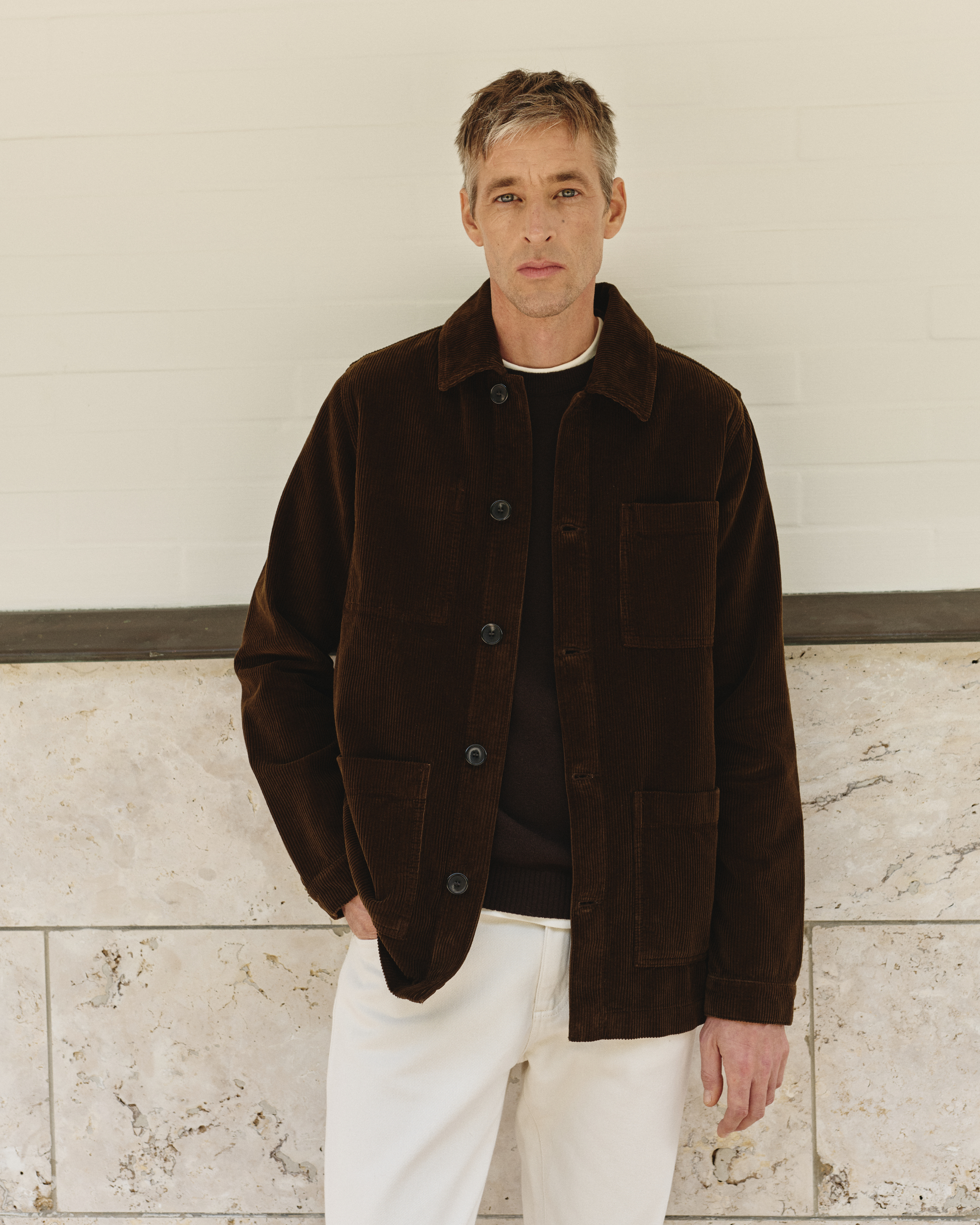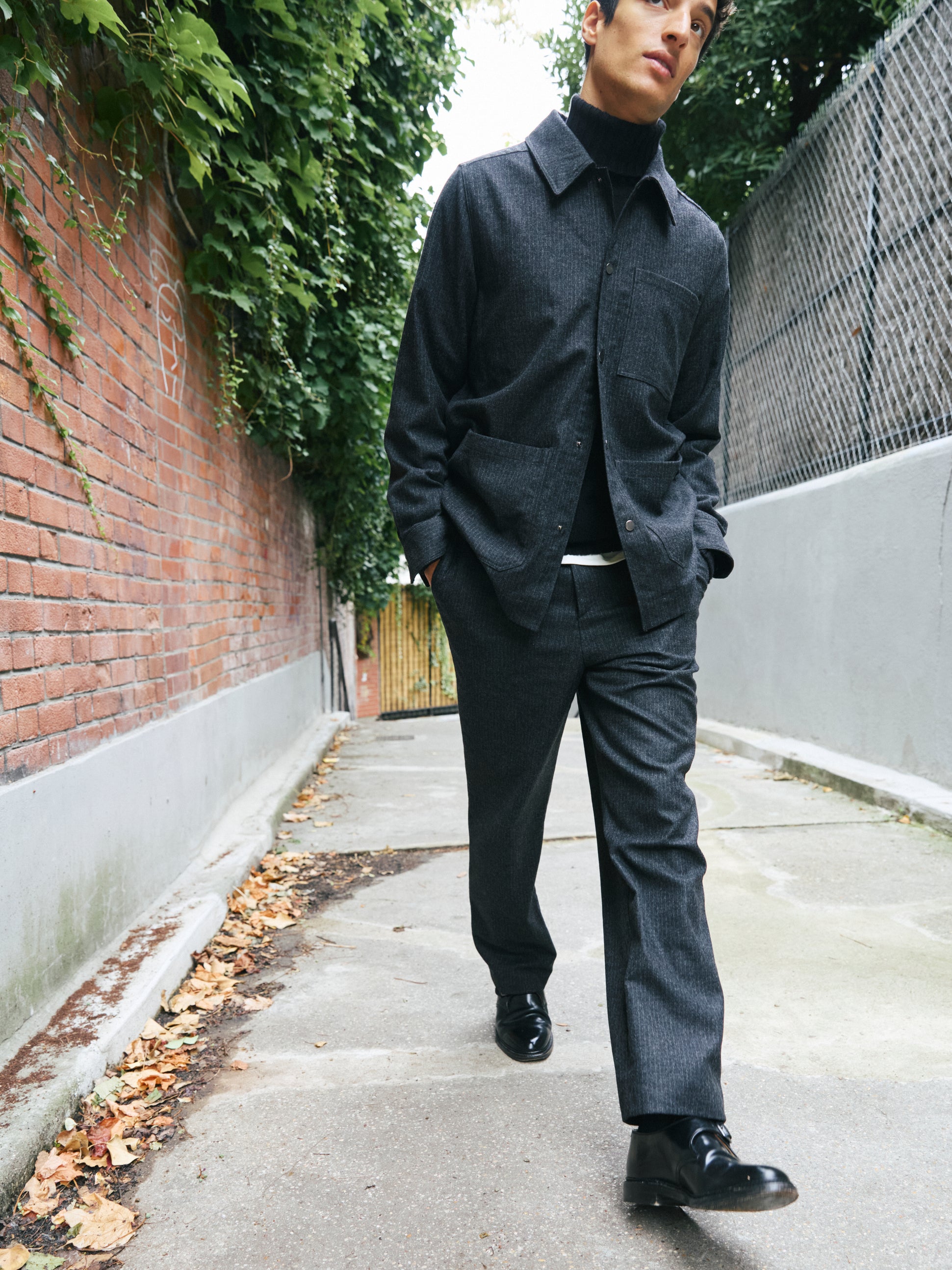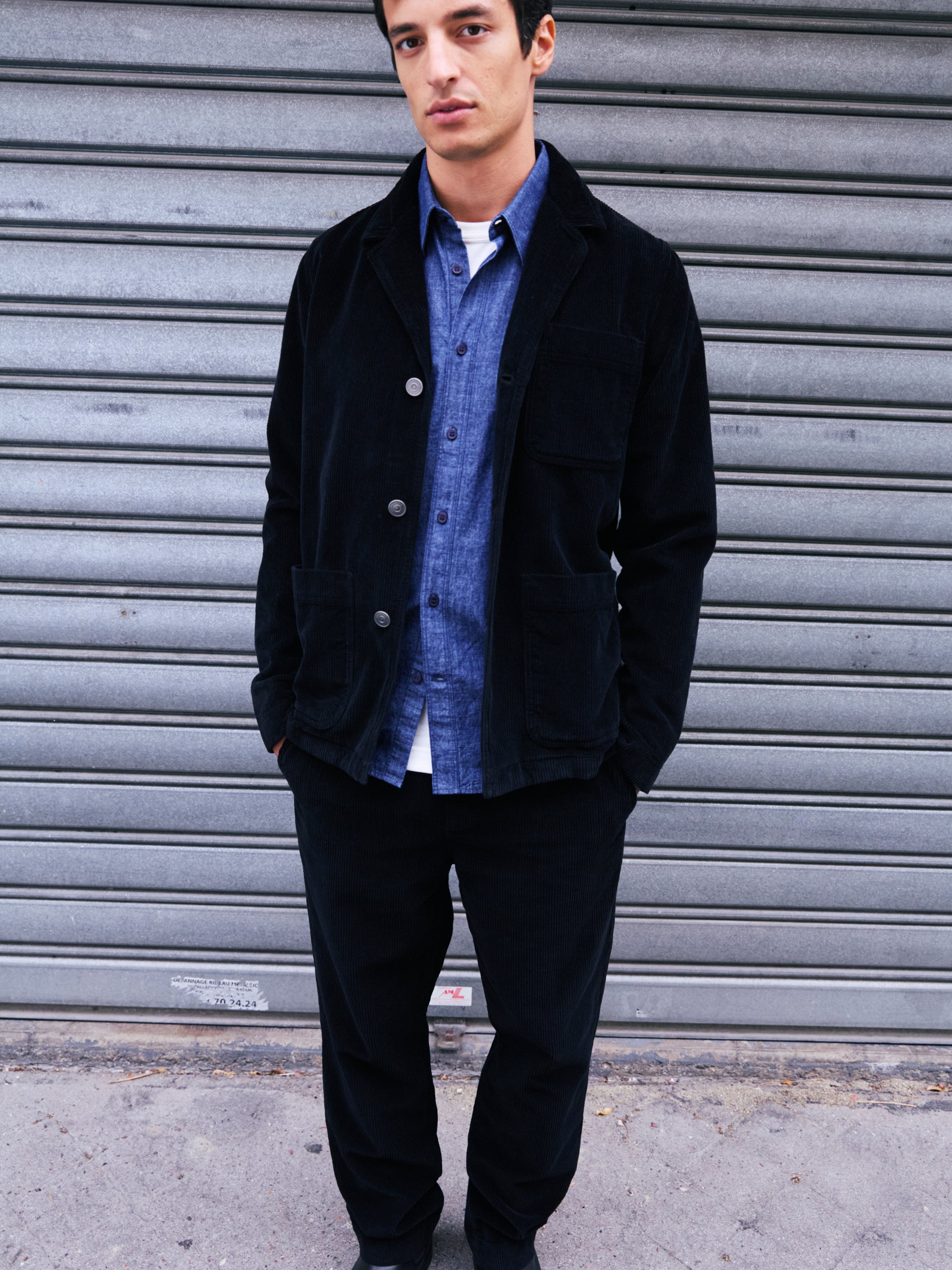 Deuxième tableau : l'accord workwear. La veste Delaunay s'associe naturellement au chino gabin workwear. La clé ? Un jeu de volumes maîtrisé, unifié par la cohérence des matières. Glissez un t-shirt Darcy entre les deux - cette pièce apporte la fraîcheur nécessaire à l'ensemble.